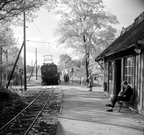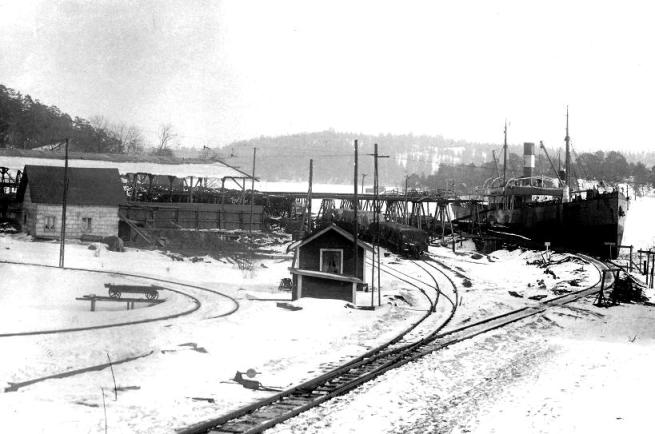 Stocksund 1920-talet [Österåkers hembygdsarkiv, okänd fotograf]. Slingspåret är snöfritt, vilket tyder på att det trafikeras. Kan bilden vara tagen redan före 1920?.