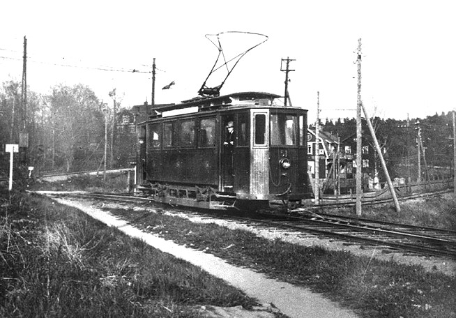 Stocksund, vagn 51 kanske på väg in i en eventuell slinga [Wikimedia Commons, okänd fotograf]. Oklart för mig vad som är slingspår respektive hamnspår.