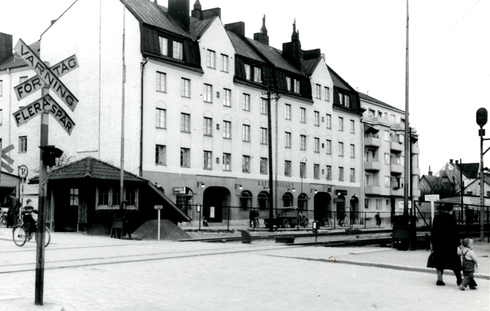 Huvudsta Central någon gång mellan 1946 och 1960. Fotograf Eric Lundquist [Järnvägsmuseet, bild KBDN00396]. Endast en fällbom synlig. Den märkliga lyktan (se delförstoring) tycks inte sitta på kryssmärkesstolpen. Det är dock förmodligen inte en s k vridlykta mekaniskt kopplad till fällbomsstativet.