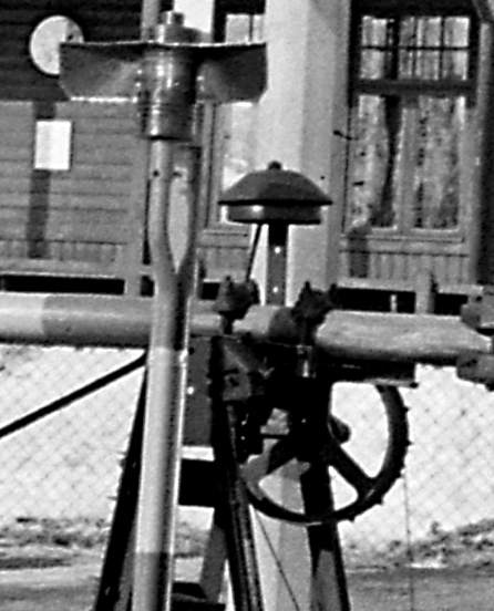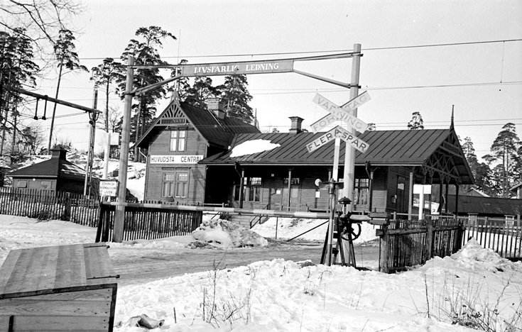 Huvudsta Central någon gång mellan 1946 och 1960. Fotograf Eric Lundquist [Järnvägsmuseet, bild KBDN00396]. Endast en fällbom synlig. Den märkliga lyktan (se delförstoring) tycks inte sitta på kryssmärkesstolpen. Det är dock förmodligen inte en s k vridlykta mekaniskt kopplad till fällbomsstativet.